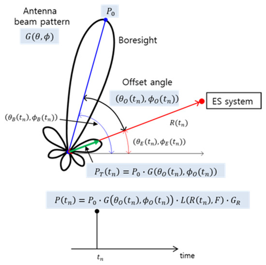 The received signal strength at each pulse arrival time is primarily influenced by the radar’s scanning pattern, transmission power, and environmental factors, such as distance, antenna gains, and free-space path loss [6]. As shown in the radar received signal strength model in Figure 1, the offset angle between the radar boresight and the ES system at a specific time plays a significant role. The offset angle and is determined as the angular difference between the ES system’s direction of and and the radar’s boresight of and . The transmission power directed toward the ES system is described as a function of the maximum transmission power and the gain dependent on the offset angle: