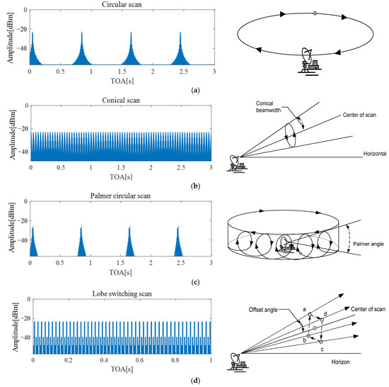 Traditional radar identification methods rely on signal parameters, such as frequency, pulse width, and pulse repetition interval (PRI), to classify radar types [1,2,3]. However, the rapid increase in electronic equipment and the development of advanced radar jamming and countermeasures have degraded the electromagnetic spectrum environment. This has led to ambiguities in signal identification because these conventional parameters alone are often insufficient to distinguish between radar types, particularly when signals share similar characteristics. Consequently, there is growing interest in utilizing additional radar signal attributes, such as scan patterns, to improve the classification performance [4,5,6,7,8,9,10].