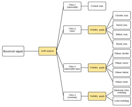 In this section, we propose a decision-tree-based algorithm for effectively classifying radar scan patterns from the signals received by an ES system. This approach categorizes the received signals according to the 11 representative scan patterns modeled in Section 2 through a hierarchical structure that refines classifications progressively. The algorithm initiates with a general categorization using AMP analysis at the top node and then narrows down to specific patterns in subsequent nodes through a visibility graph. This hierarchical structure reduces computational complexity by first organizing signals into broad categories, allowing visibility graph analysis to focus on detailed classification within each category.
