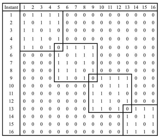 When converting a time series into a visibility graph in this way, we can define a degree distribution matrix, which is the number of connections between the nodes in the visibility graph. If there is a connection between and , the columns and rows of the visibility graph matrix have a value of 1; otherwise, they have a value of 0. An example of a visibility graph matrix constructed according to this rule is shown in Figure 5. The degree distribution matrix, which varies with different radar scan patterns, enables effective differentiation of scan patterns by highlighting distinct structural features.