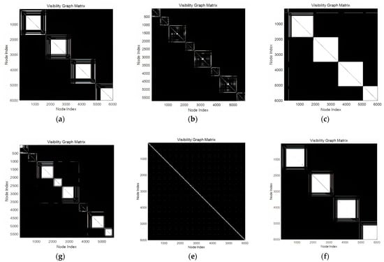 Figure 6 shows the visibility graphs corresponding to the radar reception signals for the various scan methods. The circular scans, as depicted in the visibility graph, exhibited a repetitive pattern owing to the uniform motion of the radar beam, which consistently scanned a 360° azimuth. This uniform motion causes the signal strength to remain consistent over time, resulting in repeated structures in the visibility graph. In contrast, the bidirectional sector scans displayed smaller patterns with two distinct shapes alternating in the visibility graph. The bidirectional movement of a radar beam generates alternating AMPs that manifest as distinct repetitive structures. The helical scans produced visibility graphs similar to the circular scans, but with variations in pattern size owing to the increasing elevation angle during scanning. As the elevation angle increased, the primary lobes in the signal became smaller, leading to visible connections between the larger and smaller lobes in the graph. The raster scans, which also utilize a multi-bar scanning structure, exhibited smaller primary lobes at higher elevations, forming connections between lobes of different sizes in the visibility graph. The conical scans that follow a sinusoidal pattern created distinct diagonal repetitions in the visibility graph. In contrast to the other scan patterns, a periodic sinusoidal signal generated specific connection points that appeared regularly in the graph. The Palmer scans, which combine conical with circular, sectoral, raster, and helical scans, exhibited unique high-frequency components in their visibility graphs. The Palmer circular and sector scans resembled the visibility graphs of the corresponding non-Palmer scans, but included areas where the high-frequency components disrupted visibility. The Palmer helical and raster scans also shared similarities with their respective standard versions; however, the high-frequency distortions inherent in the Palmer scans caused noticeable differences in the visibility graphs.