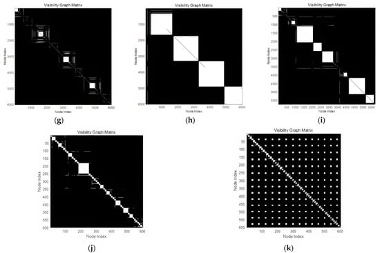 Visibility graph of the radar scan pattern received signals: (a) circular scan; (b) sector scan; (c) 4-bar helical scan; (d) 4-bar raster scan; (e) conical scan; (f) Palmer circular scan; (g) Palmer sector scan; (h) 4-bar Palmer helical scan; (i) 4-bar Palmer raster scan; (j) electronic lobe-switching; (k) lobe-switching.