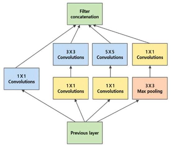GoogLeNet is a neural network architecture that won the 2014 ILSVRC (ImageNet Large-Scale Visual Recognition Challenge). The key innovation of this model lies in the introduction of the inception module, as shown in Figure 7, which enables both the expansion of the network depth and the broadening of its width. Traditional convolutional neural network (CNN) architectures use layers that are sequentially connected, each consisting of a single convolutional operation followed by pooling. GoogLeNet uses inception modules that apply parallel convolutional filters of varying sizes and pooling operations, and the results are concatenated along the channel dimensions. The inception module integrates 1 × 1, 3 × 3, and 5 × 5 convolutional filters with 3 × 3 max-pooling operations, thereby allowing the network to process information at different scales simultaneously. Among these, the 1 × 1 convolution plays a crucial role in reducing computational complexity and improving network efficiency.