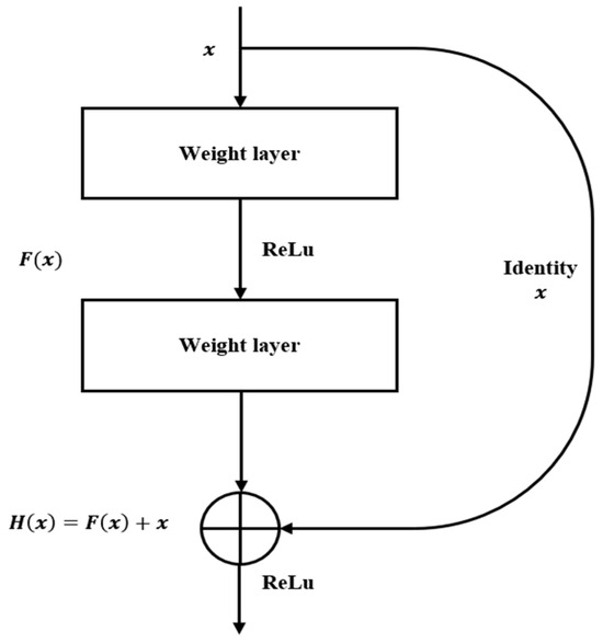 Figure 8 illustrates the shortcut connection structure in the ResNet algorithm, which is essential for its function. In the ResNet34 architecture, after passing through 16 shortcut structures, the algorithm can classify the input data with a high accuracy. These shortcuts, also referred to as identity mappings, allow the input to bypass unaltered convolutional layers. This preserves critical information while the data are processed through the network, ultimately improving classification outcomes. The convolution layers in the weight blocks handle feature extraction with a rectified linear unit activation function employed to prevent the performance degradation expected in deep networks. The objective of a traditional neural network is to approximate the output directly, but ResNet instead focuses on learning the residual function . This residual learning approach simplifies the parameter optimization and mitigates issues, such as vanishing and exploding gradients. Identity mappings in the shortcut connections of ResNet contribute to improved classification accuracy while reducing network complexity.