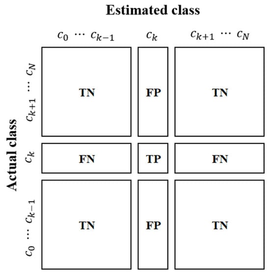 A confusion matrix is an grid used to assess the performance of the classification model, where denotes the number of target classes. This matrix allows a comparison between the actual target values and the predictions made by the model, providing an apparent visual representation of the accuracy and misclassification rates of the model. Figure 9 illustrates the confusion matrix for the multiclass classification model with classes. The matrix compiles the correct and incorrect classifications for each class into a confusion matrix , where represents the number of instances in which the actual class is estimated by class . The actual class is the actual value, whereas the predicted class is the output of the model. TP and TN indicate instances where the model correctly predicted the actual values, whereas FP and FN represent instances where the predictions of the model differed from the actual values. Each term is defined as follows: