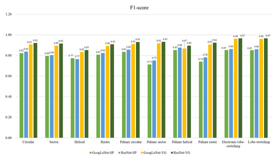 An F1-score graph is shown in Figure 10 to further illustrate the performance of the classification models in Stage 2. While the precise performance metrics are presented in Table 6, the graph provides a visual representation of the F1-scores for each radar scan pattern class across the different classification methods: GoogLeNet-SP, ResNet-SP, GoogLeNet-VG, and ResNet-VG. In the graph, the scores are rounded to two decimal places for simplicity, making it easier to identify the performance differences among the methods. Here, SP refers to spectrogram-based classification, and VG denotes the visibility-graph-based approach.