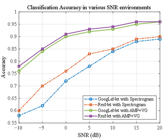 To evaluate the robustness of the proposed AMP + visibility graph (VG) framework, we compared its classification performance with traditional spectrogram-based methods across a range of SNR levels, from −10 dB to 20 dB. Four classification methods were tested, combining GoogLeNet and ResNet with spectrogram and visibility graph feature sets.