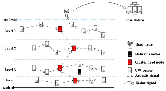 This section mainly introduces the model of the proposed scheme. As shown in Figure 1, the BNs are distributed at sea level, the UWSNs are clustered and layered according to the depth of the UW-sensors, the UW-sensor within each time transmits the packets to the cluster head node (CH) inside the cluster, and the CH in each layer accepts the data sent by other UW-sensors and then forwards the packet to the previous CH until it reaches the BN. The non-CH common nodes in the first layer near the BN node can directly transmit data to the BN. The underwater nodes transmit data to avoid the MN detected by the trust model to ensure data security. After calculating the trust value of UW-sensor, the UWSNs will exclude MNs from being pre-selected nodes for data transmission. Before data transmission we need to perform a two-hop availability check on the neighboring nodes to find the void nodes. After removing the void nodes, a path with a smaller total wiring distance is constructed from the remaining neighbor nodes for transmission.