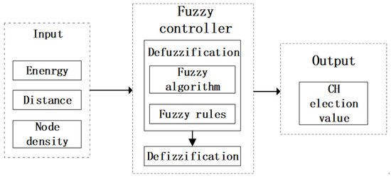 The use of fuzzy algorithms [22] is able to better solve fuzzy, difficult-to-quantify problems by mimicking human experience and decision-making behavior to arrive at a simple and effective overall evaluation of the object or physical object, so in this paper study we used a fuzzy algorithm to evaluate three indicators for each node in the cluster to determine the node that is more suitable to take on the role of CH. As shown in Figure 2, the algorithm is divided into three parts: first of all, we have to input three fuzzy variables into the fuzzy controller; in the fuzzy controller the fuzzy variables will be fuzzy, through the fuzzy algorithm as well as the fuzzy rules to obtain the fuzzy evaluation of the things; and then the fuzzy evaluation is de-fuzzified to obtain an accurate value.