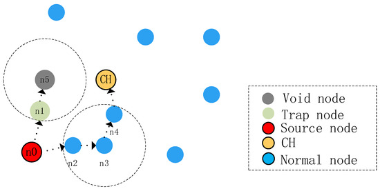 For two-hop availability checking, as shown in Figure 3, when node n0 of the data sends a packet, there are two legitimate nodes and that can transmit it, and then, according to the routing protocol, we check the neighbor table of the nodes and find that both nodes have legitimate forwarding nodes and . Then, when we query the neighbor table of the node, we find that there is no adjacent node of node that can transmit the data to the CH; the protocol then marks as a void node and as a trap node, excluding as well as from the candidate set during data transmission.