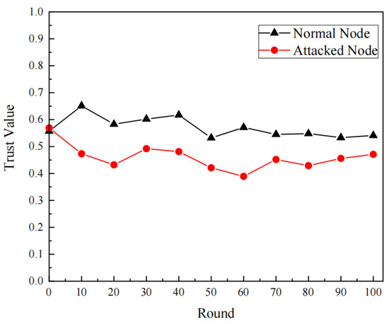 As shown in Figure 4, regarding the change of the average trust of normal UW-sensors and MNs in the UWSNs during the attack between 0–100 rounds, the average trust of the normal UW-sensors of the proposed scenario fluctuated between 0.55 and 0.65, and the MNs’ average trust value of the UW-sensors stabilized between 0.4 and 0.5 after 10 rounds of updating the trust value, so in the previous section setting the MN detection of the threshold set to 0.5 was accurate. The threshold of 0.5 is the data point obtained from the simulation experiment. Because the scheme calculates the impact of the environment on data transmission, the threshold of 0.5 depends on the network and is not fixed.