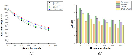 (a) Residual energy vs. number of turns; (b) AEC vs. number of nodes.
