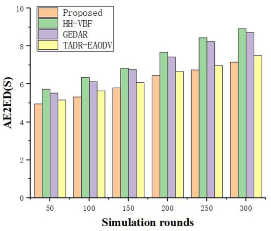 As shown in Figure 6, as the number of simulation rounds increases, the AE2ED also increases. This is mainly due to the fact that, as the UWSN operates, some of the UW-sensors consume energy too quickly, resulting in data forwarding paths having to choose nodes with longer total cabling distances. The AE2ED of the scheme is always lower than the other three schemes, while HH-VBF and GEDAR have the worst performance because these two algorithms are limited to nodes within the radius of the pipeline or nodes shallower than the current node, which is not flexible enough in forwarding node selection, resulting in their higher AE2EDs.