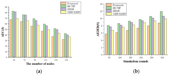 (a) AEC vs. number of nodes (20 MN); (b) AE2ED vs. rounds (20 MN).