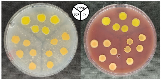 The Cff bacterial strains used here, and their main features, are reported in Table 1. They include three representative and different colour variants. These are Cff P990, Cff 50R, and Cff C7, which are yellow-, red-, and orange-pigmented, respectively. For long-term storage, Cff strains were preserved in 40% glycerol at −80 °C, and subcultured when needed. Cff strains were routinely grown on nutrient broth yeast extract medium [38] and on Luria Bertani (LB) medium [39] both as liquid and solid cultures and incubated at 26 °C. Moreover, in order to mimic the bean seed physico-chemical environment, the so-called “naturalised media” were newly developed here for Cff growth and PA analysis. Basically, Cannellino and Borlotto bean varieties were separately used to produce flour to be then used to support Cff growth. After several preliminary attempts, the final flour concentration in each naturalised medium was established to be 36 /. The different agarised media were then spotted with several drops (5 /each) of a fresh Cff bacterial suspension (OD600 = 0.8) (Figure 1). After an incubation at 26 °C for 14 days, Cff colonies were used as such for pigment extraction, while they were overlayed with the same medium previously used for their growth (20 mL/plate) to perform both optical and PA measurements (see Figure S1).