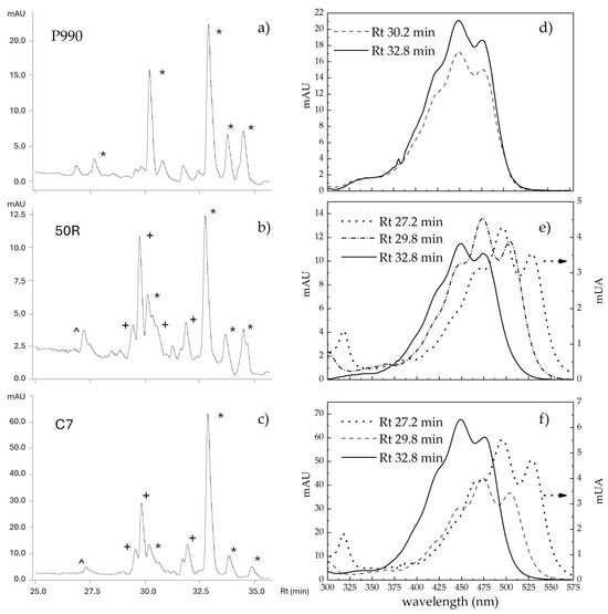 HPLC chromatograms of the methanolic extracts of Cff P990 (a), Cff 50R (b), and Cff C7 (c) pigments, after 14 days of growth on Cannellino naturalised medium. Different symbols mark the peak with different absorbance spectra corresponding to C.p. 450 (*), C.p. 473 (+), and C.p. 496 (∧) compounds. Spectra of the main peaks, acquired during elution in methanol, are reported in (d–f) for Cff P990, Cff 50R, and Cff C7, respectively.