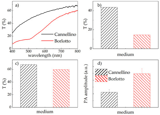 (a) Total transmittance spectra from the Cannellino- (black line) and the Borlotto-based media (red line). Comparison of the overall transmittance signal at 485 nm (b) and at 800 nm (c) between Cannellino- (black line) and Borlotto-based (red line) media. (d) Comparison of the PA amplitude between Cannellino- (black line) and Borlotto-based (red line) media excited by the whole laser white emission.