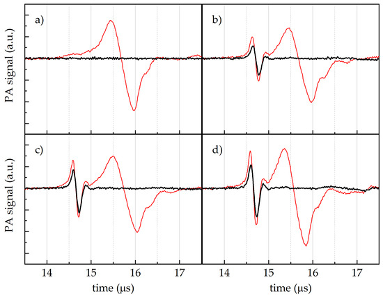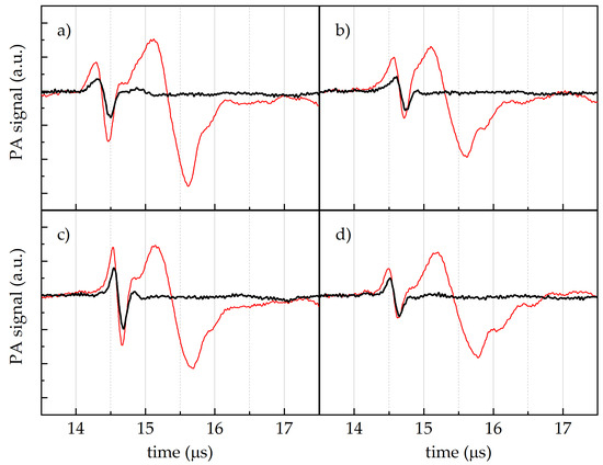 PA signal vs. time of arrival to the transducer from the Borlotto naturalised medium, after the excitation with the full laser emission (red lines), and with the laser emission filtered by the KG3 filter (black lines) at four different sample zones: (a) uninoculated point, (b) Cff P990 strain spot, (c) Cff 50R strain spot, and (d) Cff C7 strain spot.