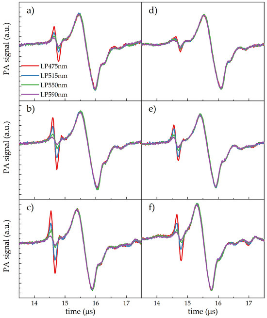 PA signal vs. time of arrival at different excitation wavebands defined by the laser emission spectrum combined with long-pass (LP) filters (at cut-on wavelengths of 475, 515, 550, and 590 nm) from spots of the P990 (a,d), 50R (b,e), and C7 (c,f) Cff strain grown in the Cannellino (a–c) or Borlotto naturalised media.