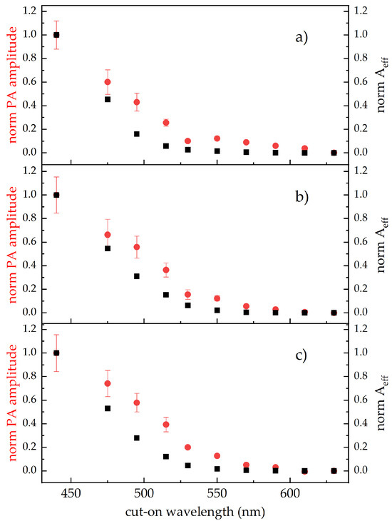 (a–c) Amplitude of the bacterial PA signal (red circles) and the (black squares) of Cff pigments as a function of the excitation waveband. Wavebands are identified by the cut-on wavelengths of the long-pass filters from 475 nm to 630 nm. Each set of data is normalised to the first point at 440 nm corresponding to the measurement with the whole laser emission excitation.