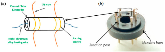 The synthesized ZnO samples were prepared as gas sensor. (1) First, a certain amount of sample is mixed with a small amount of deionized water, and then put into an agate mortar for grinding and forming a slurry; (2) the slurry is carefully applied with a brush to the electrode shown in Figure 1, which is composed of a ceramic tube (length 4 mm, outer diameter 1.2 mm, inner diameter 0.8 mm), a pair of Au ring electrodes and four Pt wires. A nickel-chromium (Ni-Cr) alloy coil is inserted into the middle of the ceramic tube as a heating wire to adjust the operating temperature; (3) welding the above-mentioned elements to the binding post of bakelite base; (4) after the slurry was dried at room temperature for 30 min, the ZnO material was aged at 250 °C for 6 h.