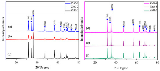 The XRD plots of ZnO. (a) ZnO-1; (b) ZnO-2; (c) ZnO-3; (d) ZnO-4; (e) ZnO-5; (f) ZnO-6.