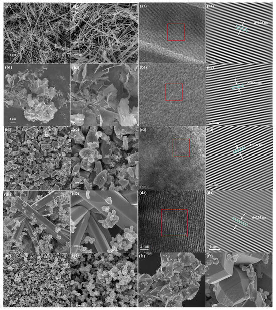 SEM and TEM characterization of ZnO samples. For ZnO-1, ZnO-2, ZnO-3, ZnO-5, ZnO-4, ZnO-6. (a1–f1) The low-magnification SEM; (a2–f2) high-magnification SEM. For ZnO-1, ZnO-2, ZnO-3, ZnO-5, (a3–d3) HRTEM; and (a4–d4) inverse FFT images from the region indicated by the solid box (red).