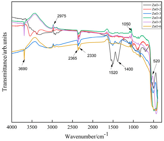 The samples were characterized by FTIR and the results are shown in Figure 4. The peak of ZnO at 520 cm−1 is attributed to the Zn-O stretching vibration produced by the characteristic peaks of pure ZnO. Other peaks were attributed to CO2 and water in the test environment, independent of the purity of the ZnO sample itself. No other bonds and groups were found in this FTIR mode, indicating that the ZnO sample was of high purity.