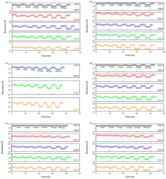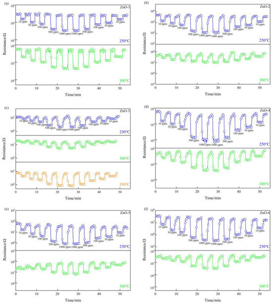Reproducibility of ethanol gas detection by ZnO crystals prepared from different alkaline sources at different operating temperatures. (a) ZnO-1; (b) ZnO-2; (c) ZnO-3; (d) ZnO-4; (e) ZnO-5; (f) ZnO-6.