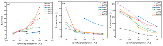 The test temperature at which the gas sensor has the best response to ethanol gas is the optimum operating temperature of the gas-sensitive material. However, in practical production life, it is also necessary to consider the life of gas-sensitive materials and components, the response and recovery speed to ethanol gas. Due to the limitation of the instrument’s range, the response, response time, and recovery time of the ZnO-based gas sensor in the temperature range of 150–350 °C were tested in this experiment. As shown in Figure 6a, the response of ZnO-2~ZnO-6 crystals to ethanol gradually increases with the increase of operating temperature, and the maximum gas response is 68.0, 8.6, 17.4, 39.9, and 52.5 at 350 °C, respectively. The response of ZnO-1 to ethanol gas increased first and then decreased. The maximum value (8.9) is reached at 200 °C, because the surface activity of the gas-sensitive material is relatively low and the adsorption capacity of ethanol is weak when the working temperature is low, so the response is low; with the increase in temperature, the amount of adsorbed oxygen on the surface of the gas-sensitive material increases, the surface activity of the material increases, and the response increases; the desorption rate of ethanol gas is greater than the adsorption rate when the working temperature is continuously increased, and the desorption rate of ethanol gas is greater than the adsorption rate, as shown in Figure 6b,c; the response time and recovery time of all ZnO materials to ethanol decrease with the increase in temperature, which indicates that the reaction speed and desorption process of the material are accelerated at high temperature.