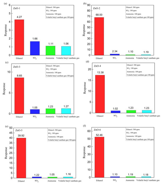 To further investigate the selectivity of ZnO-based sensors, as shown in Figure 8, the responses to four different gases (ethanol, SO2, ammonia, volatile butyl xanthate gas) were tested at an operating temperature of 350 °C, and it was found that all sensors had the highest response values to ethanol and showed excellent selectivity for ethanol.