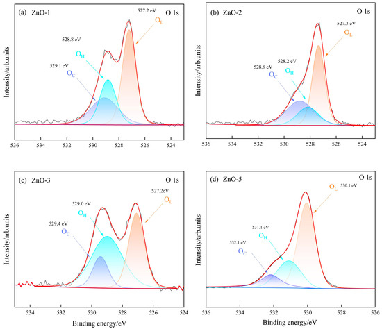 XPS spectral analysis curves of ZnO. (a) ZnO-1 O1s; (b) ZnO-2 O1s; (c) ZnO-3 O1s; (d) ZnO-5 O1s.