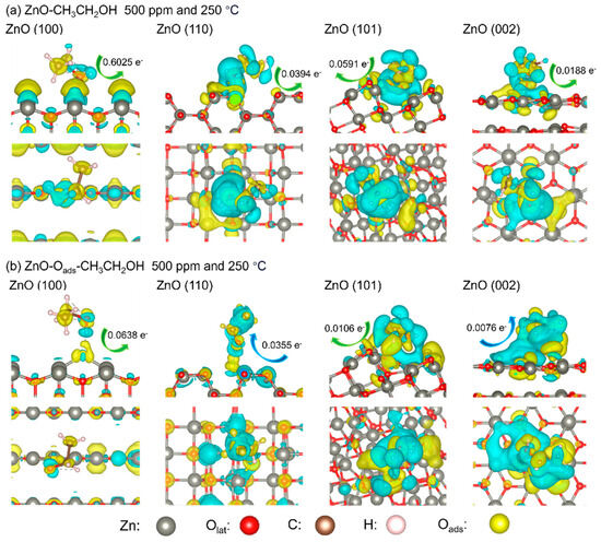 Charge transfer diagram between CH3CH2OH and representative adsorption sites on (100), (110), (101), and (002) surfaces of ZnO. The yellow and blue regions represent electron-rich and -deficient areas.