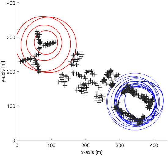 In the figure, the blue circles represent the majority of APs that cover the common area and were detected during the positioning stage. On the other hand, red circles represent APs that do not overlap with the majority of detected APs. Therefore, a localization request that includes all these APs is assumed to include spoofed signals.