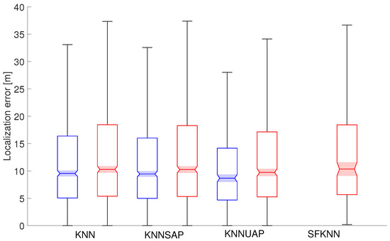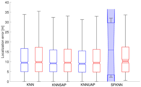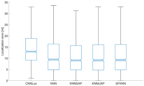 From Figure 5 it can be seen that the statistical parameters of the localization errors are very similar, which is in line with the mean error values presented in the tables above. The statistical parameters of localization error deviate only for SFKNN in Scenario 1, since the majority of localization requests were filtered out, and therefore, the uncertainty of the achieved median value is extremely large.