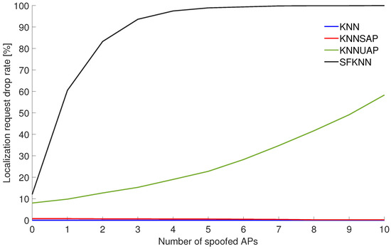 In this case, it can be seen that similarly to Scenario 1, KNN and KNNSAP are not dropping localization requests when the number of spoofed APs increases. Moreover, the SFKNN algorithm again achieved the highest number of dropped requests. However, it should be noted that in Scenario 2 the the drop rate did not achieve 100%, which is due to the fact that some requests included spoofed APs from a nearby building and thus the algorithm was not able to detect the spoofing.