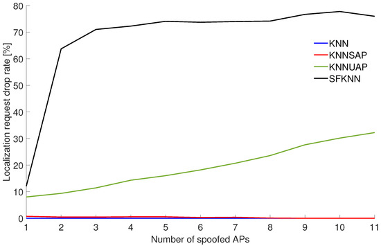 The next step was the evaluation of the performance of proposed algorithms in the scenarios with the spoofing of APs. Figure 3 shows the localization request drop rate, i.e., denial of positioning, because conditions were not met for the given algorithm.