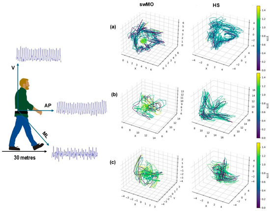 Phase space reconstruction plots of a representative patients with MO (plots on the (left)) and a healthy subject (plots on the (right)) for the (a) vertical (V), (b) antero-posterior (AP), and (c) medio-lateral (ML) directions of the acceleration signals. The color of each line segment corresponds to the sLLE value at that point in time, as indicated by the colormap. Lighter colors indicate higher divergence levels.
