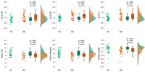 Compared with HS, subjects with MO resulted in higher sLLEAP (p < 0.01; d = 0.66), sLLEML (p < 0.01; d = 0.89), and sLLEV (p < 0.01; d = 0.71) and reduced pelvic rotation (p <0.01; d = 0.91), pelvic tilt (p < 0.01; d = 0.83), and stride length values (p = 0.03; d = 0.45) (Figure 2).