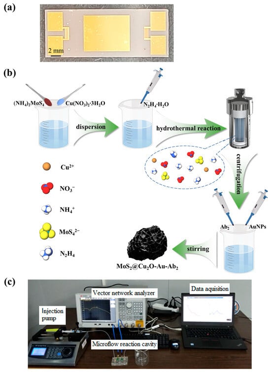 (a) Photo of the fabricated L-SAW sensor chip; (b) synthesis process of MoS2@Cu2O-Au-Ab2 conjugates; (c) photo of the experimental setup.