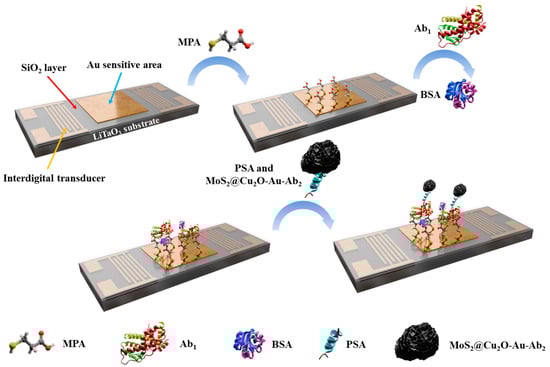 The L-SAW immunosensor functionalization process is illustrated in Figure 2. First, the sensor surface was treated with an MPA solution. MPA molecules self-assembled onto the gold surface of the sensitive area via gold–thiol (Au-S) bonding, providing a stable platform for Ab1 immobilization. Next, a PBS solution containing the Ab1 specific to PSA was introduced, allowing Ab1 immobilization onto the MPA layer. Subsequently, BSA was employed to block any remaining active sites on the MPA layer, minimizing non-specific binding. Finally, the target solution containing PSA was prepared by complexing PSA with Ab2 conjugated to MoS2@Cu2O-Au nanocomposites. Subsequently, PSA in the target solution was captured by the Ab1 immobilized on the sensitive area surface. This functionalization strategy created a sandwich-like sensing structure (Figure 2) on the L-SAW immunosensor chip.
