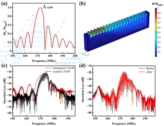 (a) Y-direction displacement amplitude spectrum of the L-SAW immunosensor surface obtained by FEA simulation; (b) normalized displacement field of the L-SAW immunosensor under peak frequency excitation; (c) FEA-simulated S21 signals and actual S21 signals of the L-SAW immunosensor; (d) S21 signals of the fabricated L-SAW immunosensor before and after injection of PBS solution.