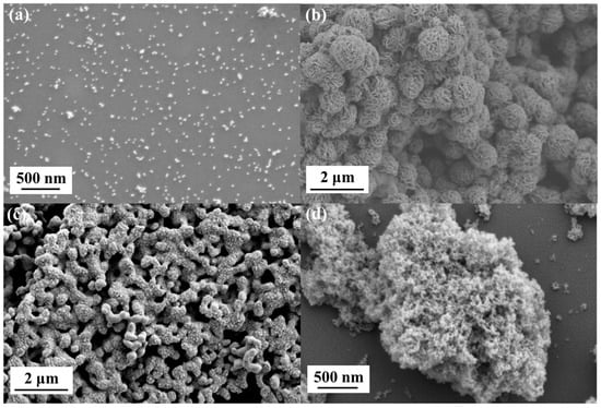 The morphology and microstructure of the synthesized nanomaterials were characterized using SEM (Figure 4). As shown in Figure 4a, the gold nanoparticles exhibit a spherical or quasi-spherical morphology with a uniform size distribution around 30 nm. The nanoparticles are well dispersed, indicating minimal aggregation. Figure 4b reveals the characteristic sheet-like structure of MoS2, forming a three-dimensional porous network composed of randomly stacked two-dimensional nanosheets. This unique morphology provides a high surface area and abundant binding sites. Figure 4c presents the structure of Cu2O nanomaterials, which display a wider size distribution ranging from 100 to 200 nm and a variety of morphologies, including spherical, polyhedral, and nanorod structures. Similarly to MoS2, the Cu2O nanomaterials possess a large specific surface area and numerous binding sites. Figure 4d displays the MoS2@Cu2O-Au nanocomposites, which exhibit a distinctive coral-like morphology. This three-dimensional spatial coral structure, formed by the interconnected MoS2@Cu2O framework decorated with well-dispersed gold nanoparticles, further increases the specific surface area and provides abundant binding sites. The porous nature of the nanocomposites facilitates the efficient capture and binding of target PSA biomolecules, highlighting their suitability for biosensing applications.