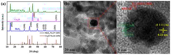 (a) XRD patterns of MoS2, Cu2O, and MoS2@Cu2O; (b) and (c) HR-TEM analysis of MoS2@Cu2O-Au.