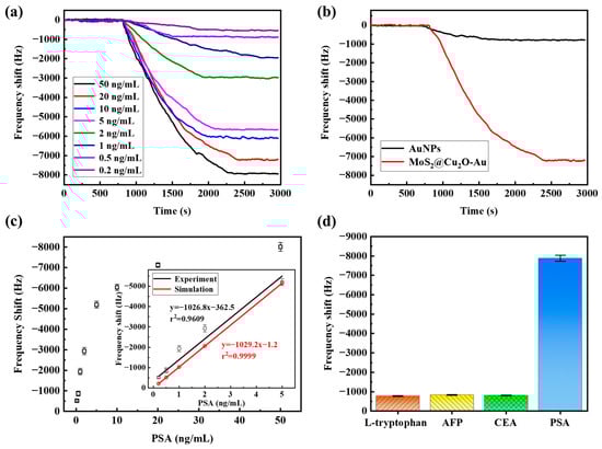 (a) Real-time responses of the L-SAW immunosensor to PSA with the concentration varying from 0.2 ng/mL to 50 ng/mL; (b) comparison of real-time responses of L-SAW immunosensors using AuNPs alone and MoS2@Cu2O-Au nanocomposites at a PSA concentration of 20 ng/mL; (c) frequency shifts corresponding to the various PSA concentrations, ranging from 0.2 ng/mL to 50 ng/mL; experimental results (black line) and simulation results (red line) demonstrate a linear relationship between the frequency shifts and the PSA concentration, spanning from 0.2 ng/mL to 5 ng/mL; (d) the selectivity analysis of the L-SAW immunosensor to 50 ng/mL solutions of L-tryptophan, AFP, CEA, and PSA.