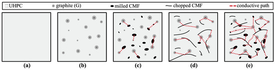 Illustration of the electrical percolation process: (a) UHPC-only (without fiber); (b) G-only; (c) G + MCMF; (d) G + CCMF; (e) G + MCMF + CCMF.