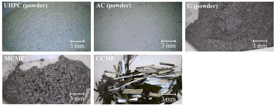 The self-sensing UHPC composite mixture used in this study includes commercially available Ductal® UHPC premix powder, alumina cement (AC—also known as calcium aluminate cement) powder that contains a high concentration of aluminate phases, specifically calcium aluminate (CaAl2O4), monocalcium aluminate (CaAl2O4), dicalcium aluminate (CaAl4O7), along with mayenite (Ca12Al14O33) and ferrite phases (CaAlFeO4), G, MCMF, CCMF, water, and HRWR (MasterGlenium 7920). Figure 2 presents magnified images of these solid components, while their material properties, including density, conductivity, and aspect ratio, are detailed in Table 3.