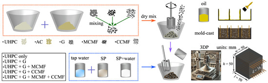 The fabrication and curing of UHPC specimens mostly followed the ASTM C1856/C1856M-17 guidelines [58], but with minor adjustments to accommodate the specific characteristics of the UHPC mix and 3D printing process. The fabrication process of the specimens is illustrated in Figure 3. First, all solid components (i.e., UHPC, AC, G, and CMF) were weighed according to the designed mixture proportions (Table 4) and dry-mixed using a Hobart mixer (H-3841, 5-Qt, Hobart Corporation, Troy, OH, USA, ASTM D5581 compliant) for two minutes to break up particle agglomerations and ensure uniform dispersion of the particles and fillers throughout the mix. Next, the HRWR/water solution was prepared by adding 1 wt% HRWR, relative to the binder weight, to the water. This solution was then added to the dry mixture and mixed for 12 to 15 min at a low rotary speed of 136 RPM, followed by 3 min at a high speed of 256 RPM, resulting in a total mixing time of 15 to 18 min. The mixing time varied within this range depending on the desired consistency and workability, which could differ based on the specific mixing proportions to achieve a fresh, homogeneous mixture with uniform filler dispersion.