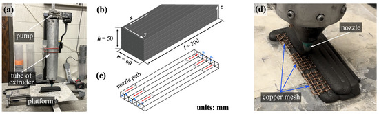 An extrusion-based commercial 3D clay printer (3D Potter 7) was used for 3DP. It has a resolution in the x and y axis of 0.15 mm, a resolution in the z axis of 0.7 mm, a printing envelope = 415 × 405 × 500 mm3, and a maximum printing speed of 200 mm/s. The overall setup of the 3D printer with key annotations is shown in Figure 4a. The printing process involved the following: (1) Feeding—the fresh UHPC composite was manually placed into the extruder tube in three consecutive pours, with each layer being rodded approximately 10 times to eliminate air pockets, and the filled tube was then installed on the printer; (2) Configuring—a circular nozzle with a diameter of 8 mm was attached to the extruder, the extrusion rate was set to 2100 mm3/s, the printing speed (the movement speed of the printer head and platform) was set to 20 mm/s, and a stand-off distance of 10 mm. The vertical shift was set to 10 mm for each subsequent layer, thus producing a 10 mm layer height. This adjustment was based on prior optimization experiments to maintain the desired overall print dimensions, prevent layer overlap or excessive compression, and ensure proper layer adhesion and surface finish quality [59]; (3) Pre-printing—the 3D printer was operated to print a preliminary filament perimeter, which was discarded to purge any air trapped in the nozzle and extruder, thereby ensuring consistent and smooth extrusion; (4) Printing—the UHPC composite was systematically deposited in sequential strips and layers according to the predefined path (Figure 4b) to complete the designed geometry. Three sets of copper meshes were inserted after the first and fourth layer of printing to form parallel electrodes, thus spaced by approximately mm, as shown in Figure 4d. This arrangement was dictated by the layer-based deposition process, which constrained the electrode placement to align with printed layers. A slightly different spacing interval for the electrodes was used for the mold-cast specimens, and taken into account in computing resistivity using Equation (1).