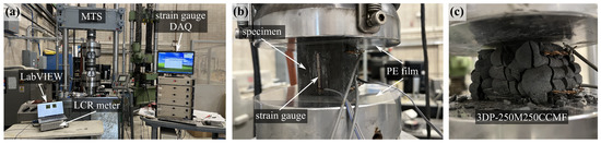 Resistance measurements were conducted using an LCR meter (Agilent 4263B, Agilent Technologies, Santa Clara, CA, USA) configured using the resistance-reactance (R-X) model with a measuring frequency of 1 kHz driven in LabVIEW to characterize the intrinsic polarization drift caused by either the dielectric nature of cementitious composites [61,62] or the direct piezoelectric effect [63,64]. The selection of the measurement frequency of 1 kHz was specifically aimed at minimizing the dielectric effect of the cementitious matrix and mitigating the issues related to electrode polarization and reactance [60,65]. This is because the use of embedded electrode meshes significantly reduces contact resistance at the interface between the electrode and the cementitious matrix by improving electrical contact and distributing the electrical load more evenly [66].